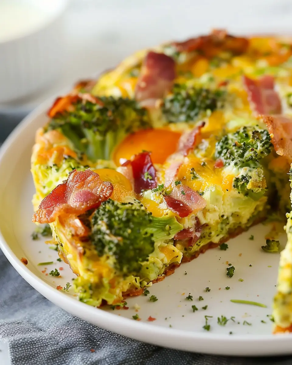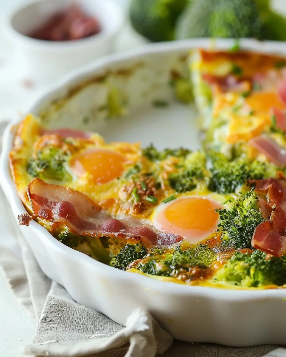 A delicious and comforting Broccoli Cheddar Egg Bake with Turkey Bacon, perfect for any meal of the day.