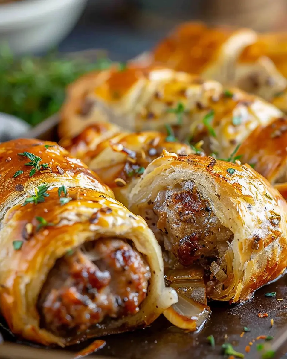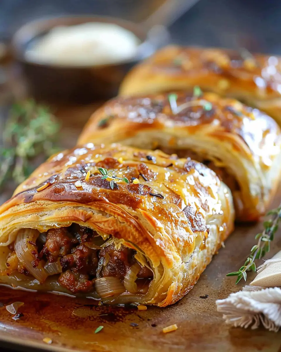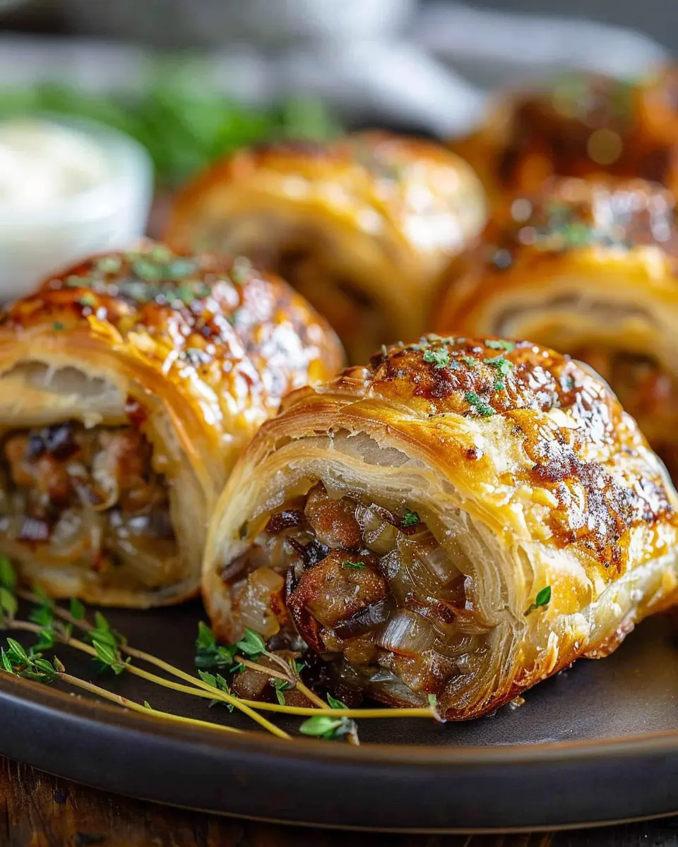In summary, savory French onion sausage rolls are not just a treat for your taste buds; they’re also a fantastic way to gather friends and family for a cozy evening. Imagine sinking your teeth into those golden, flaky layers only to find a burst of rich beef flavor and caramelized onions inside. Pair them with a zingy dip or enjoy them on their own—they’re versatile! Make these rolls for your next gathering, or even as a delightful weekend snack. You’ll wonder how you ever lived without them. For more delightful recipes like this, check out sites like Serious Eats for culinary inspiration!